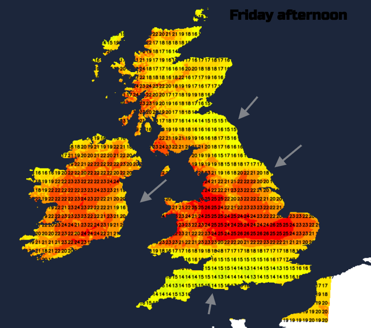 Potential for high temperatures on Friday with warmth lasting to the evening, but uncertainty for southern England and south Wales depending on the rainbands from the nearby low.