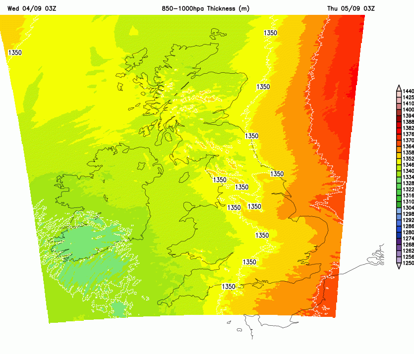 Friday evening will feel warm and close to the north of the main rain band in the south. It could be that southern counties of England see a fair evening with a light southerly breeze but there could be a distinct band of heavy rain stretching across southern Britain giving a wet end to the week. To the north of this rain, there will be a brisk northeast wind off the Sea bringing in lots of low cloud and murk. The air here is warm but it will be damp. Northwestern parts of the UK could stay dry and clear.