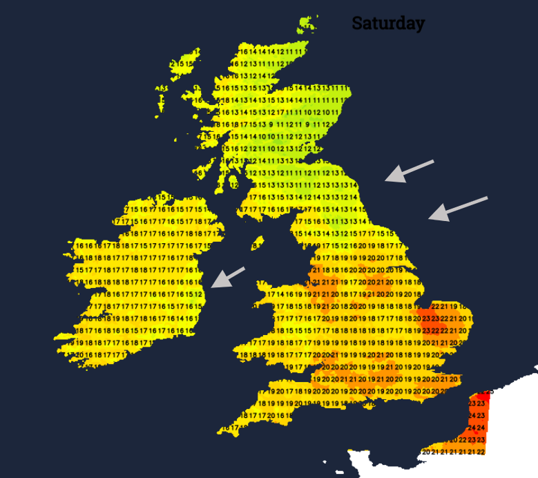 The surface winds are from the east, bringing in thicker low cloud by night. This will keep daytime temperatures subdued but will save the overnight temperatures from dipping away into single figures. Cooler air will move over Scotland at the weekend as warmer air remains further south. Temperatures could reach 24 or 25C around London.