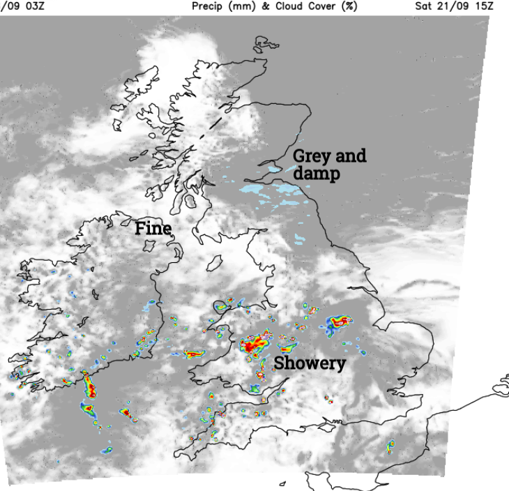 The well-scattered shower risk edges north and west during the day. Some areas will miss the showers and stay dry. You might catch a light one or experience a slow-moving torrential downpour with lightning. The UKV model takes most of the heavy showers towards Merseyside and north Wales by Saturday evening.