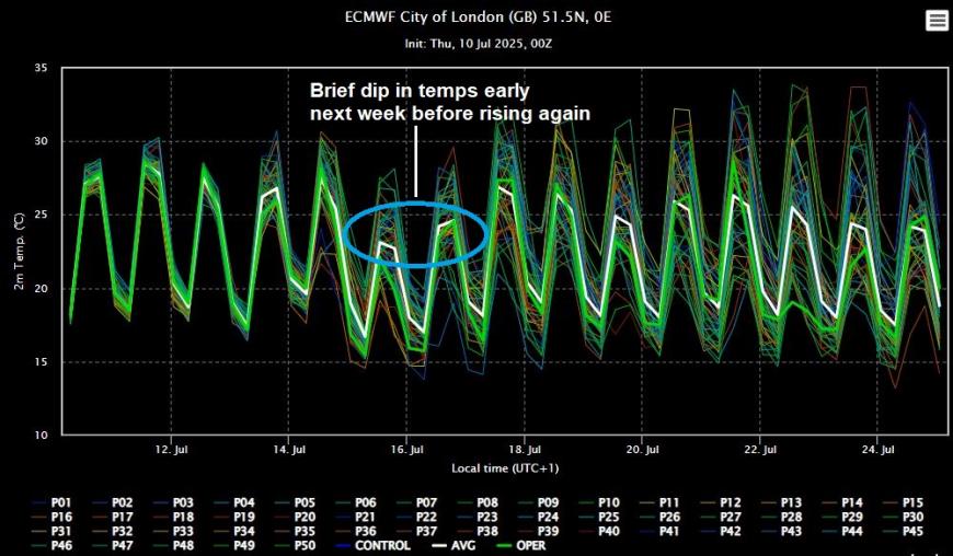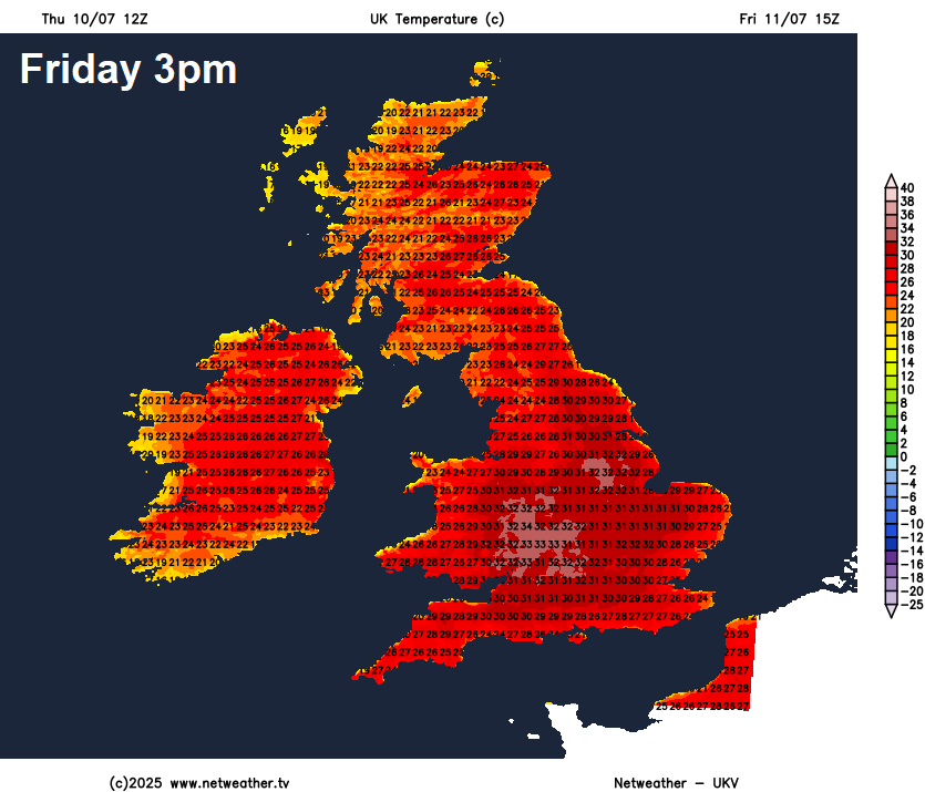 Temperatures are likely to reach the low 30s across central and southern England Friday to Sunday, peaking between 33-35C on Saturday, high 20s widely elsewhere, even in lowland Scotland, with 30C possible in the central belt or northern Highlands on Saturday. Cooler around coasts - with onshore sea breezes developing.