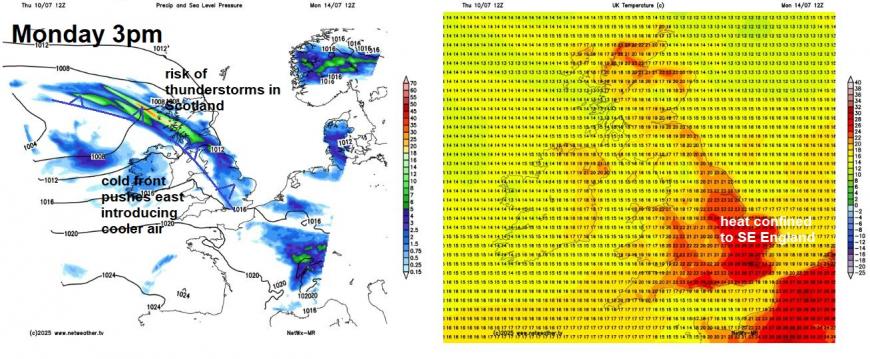 The heat looks to subside as we go into early next week, as the high pressure retreats northeast over Scandinavia and low pressure systems lurking to the west of Ireland over the Atlantic start to push a cold front eastwards on Monday, confining the heat towards SE England and East Anglia. The cold front bringing a band of showery rain, locally heavy and thundery, from the west. Rainfall amounts look patchy and slight towards the south, with the cold front weakening here as it moves into higher pressure, a greater risk of heavy thundery downpours developing across Scotland and northern England - as the cold front moves in Monday afternoon - during peak heating and with greater forcing aloft will be available too.