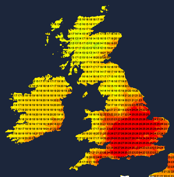 Friday sees summer returning to much of the east and south, with a much brighter day and a fair amount of sunshine. Light west or south-westerly breezes will allow temperatures to reach a very warm 24∘C to 26∘C, with 27∘C or maybe 28∘C possible in the hottest spots. Further north and west, a weakening front will bring cloud and patchy rain, but the weather will improve from the west across Northern Ireland and Scotland through the day, giving some sunshine. It will be a bit cooler here, though, with temperatures of 18∘C to 22∘C near the mark.
