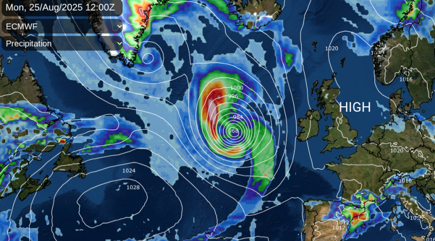 It’s a fair way off with plenty of development to come this week, never mind into next with a journey across an ocean. The GFS and ECM models are showing high pressure over the UK on this run with ex-Erin to the west, which could again draw up very warm air from the south ready for the Bank Holiday. A bit faster, and Erin would throw rain our way.