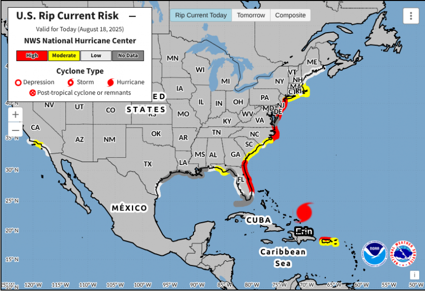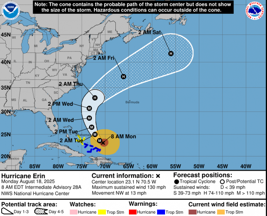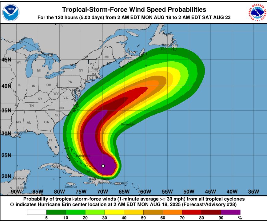 For Americans, this season is set against the Trump Administration’s cuts to the National Oceanic and Atmospheric Administration (NOAA), the agency which includes the National Weather Service (NWS) and the NHC. Even as the hurricane stays out at sea, there will be dangerous conditions this week for the island nations already under warnings or watches, but also all along the east coast of the USA, as Bermuda and east coast Canada keep watch. Erin could be south of Nova Scotia on Friday, Newfoundland by Saturday, and then making its way across the Atlantic as an ex-tropical cyclone.