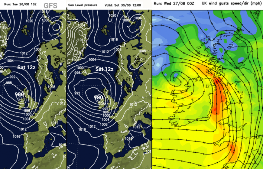 Two runs of the GFS model show the low centred to the north of Ireland and gusty southerly winds through the Irish Sea