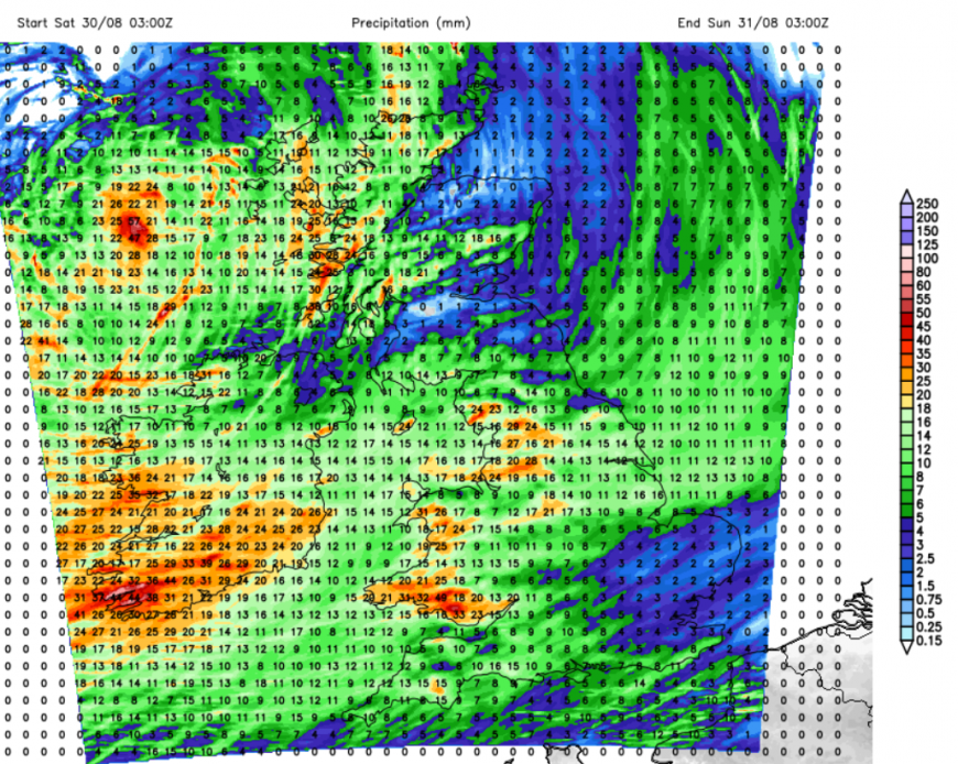 The UKV rainfall totals for 24 hours hint at some gaps, to the lee of high ground in the southerly flow, and East Anglia. There are higher totals over South Wales, the Welsh mountains, the Lake District and the Yorkshire Dales, the Peak District and the west coast of Scotland.