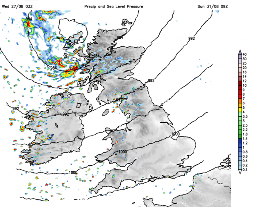 After such a lot of dry, sunny and warm to hot weather, the end of August is rather mixed. The air flow feels fresher now. However, in any sunshine, there is still a good deal of warmth lifting temperatures into the low 20sC for the middle of the week. There will be a scattering of showers from the west and bands of rain bringing heavier falls with darkening skies. As one of these passes by, the temperatures will fall. Pinning down the details of these, in terms of timings, remains tricky. It will be worth keeping an eye on the Netweather Radar for the individual showers and the progress of any rainbands as they move eastwards.