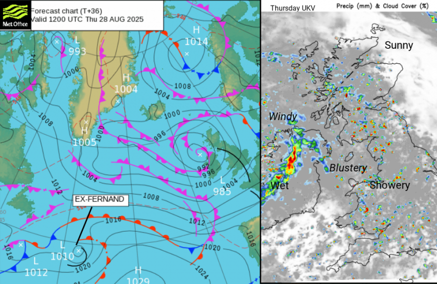 The current steer for our UK weather is a low pressure to the northwest, which was linked to the remnants of Hurricane Erin. Out at sea in the Atlantic is Tropical Storm Fernand, which will become extra-tropical as it moves across the ocean but gets entrained in developments along a frontal boundary. It adds its tropical energy and moisture to a new wave and resulting low pressure, which will be over Ireland by Saturday. Now, if you have an event at the weekend, you might have noticed that weather apps keep changing; when it's wet and when it's dry. It’s down to the developing low pressure and where it might be in relation to the UK.