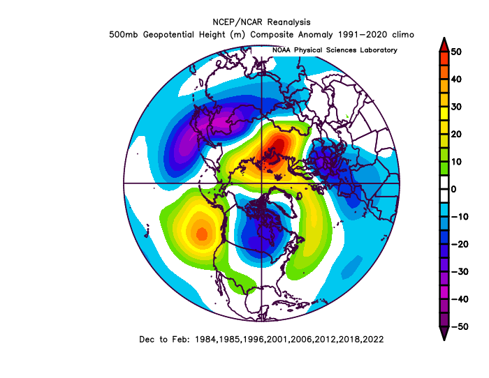 Below is a composite chart of 500 hPa heights for the 3 winter month period December - February when there was a weak or moderate La Nina and easterly QBO, winters used are from 1980s onwards, as this is when QBO data is available from.