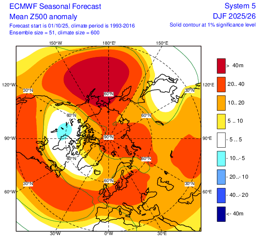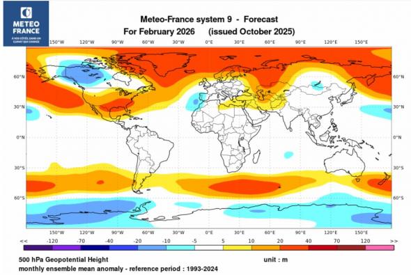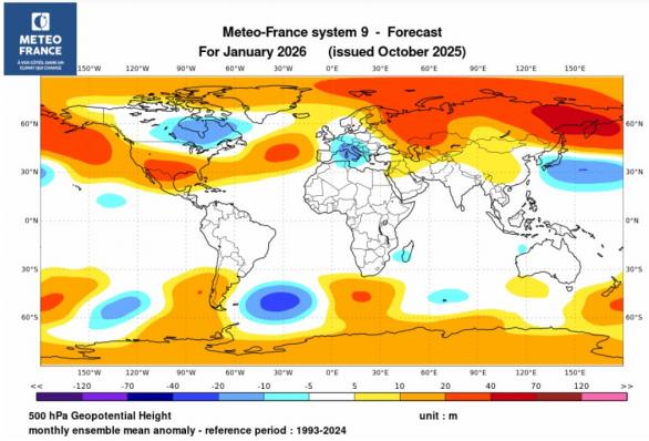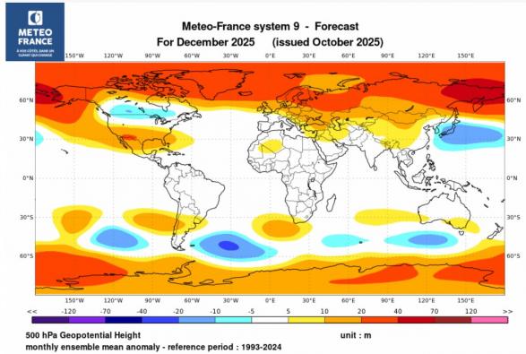 In contrast, the Meteo France seasonal October update for 500 hPa heights suggests a weaker tropospheric polar vortex with higher heights in the polar regions and lower over southern Europe than the 1993-2024 period, more particularly noticeable in January and February. This would suggest a greater chance of periods with a -NAO (negative North Atlantic Oscillation) - with no signal for above or below average temperatures over all 3 months, which suggests potential for cold spells coinciding with the -NAO periods.