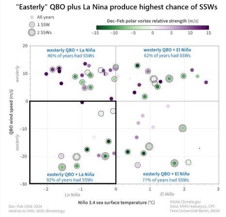 An easterly QBO favours an increase in SSW events and polar vortex disruptions; especially, when combined with La Nina. These SSW events can also lead to a greater chance of colder spells, especially mid-to-later winter.