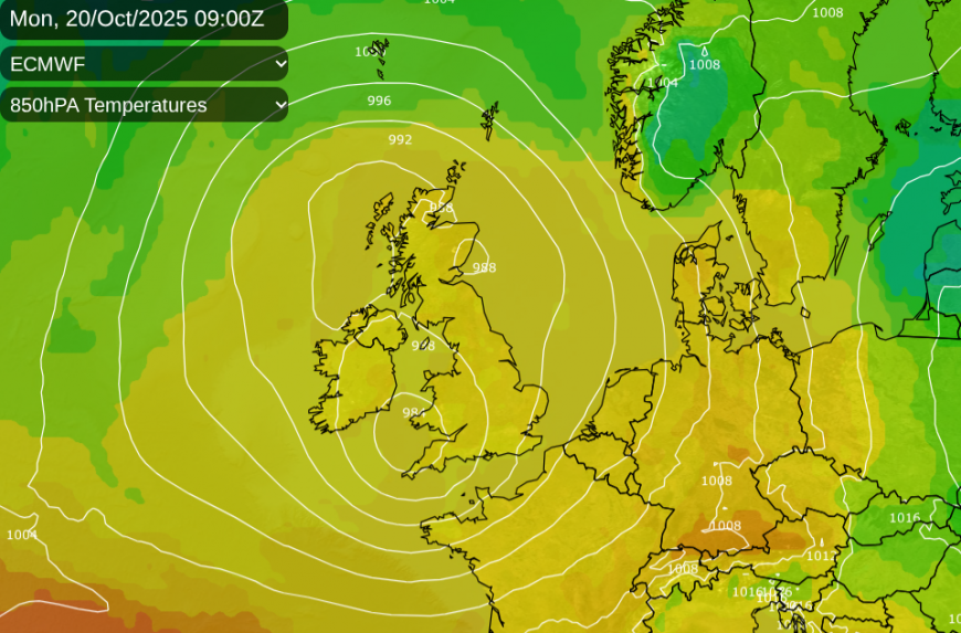 We start this week with mild air brought up from the southwest by the low pressure, which is over the UK for the start of the working week. This is the major change after the steady high pressure, there will be now be bouts of wet and windy weather.