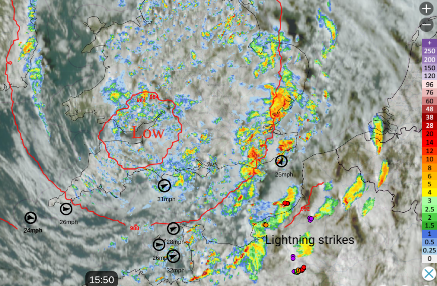 “strongest instability (and deep convection/lightning) most likely towards southern coastal areas of Wales and England – where relatively warm Sea Surface Temperatures, beneath cold air aloft, will cause more buoyancy of unstable air, given weak surface heating in sunny spells now. Lightning more isolated inland. Hail and gusty winds will accompany stronger convection”