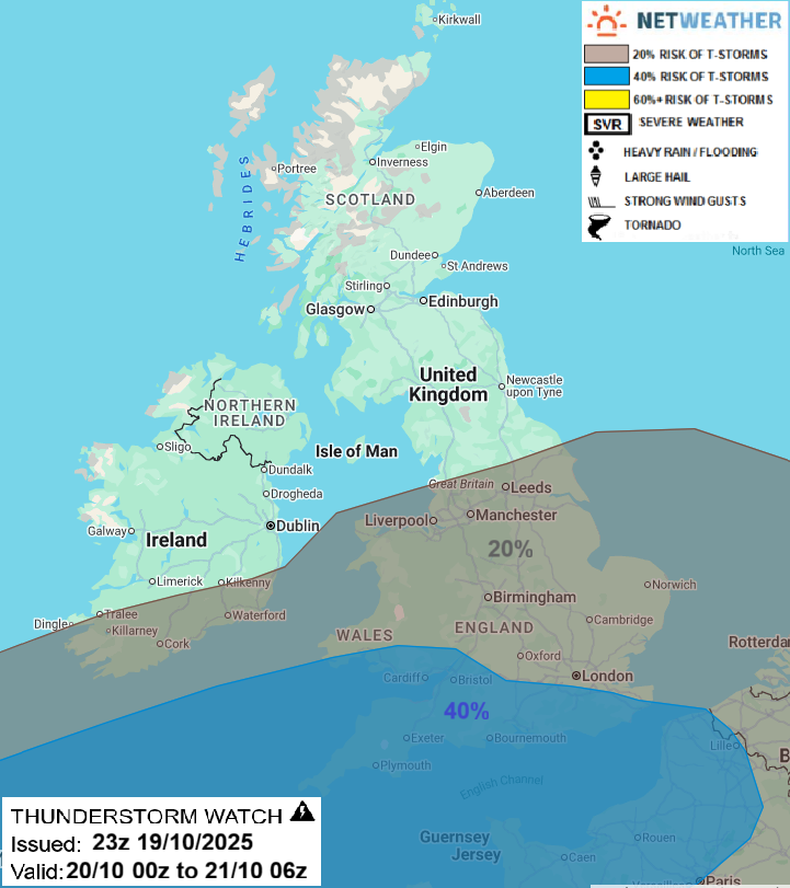 For Monday, it is southern Britain where the threat of heavy, even thundery showers. The Netweather Convective forecast