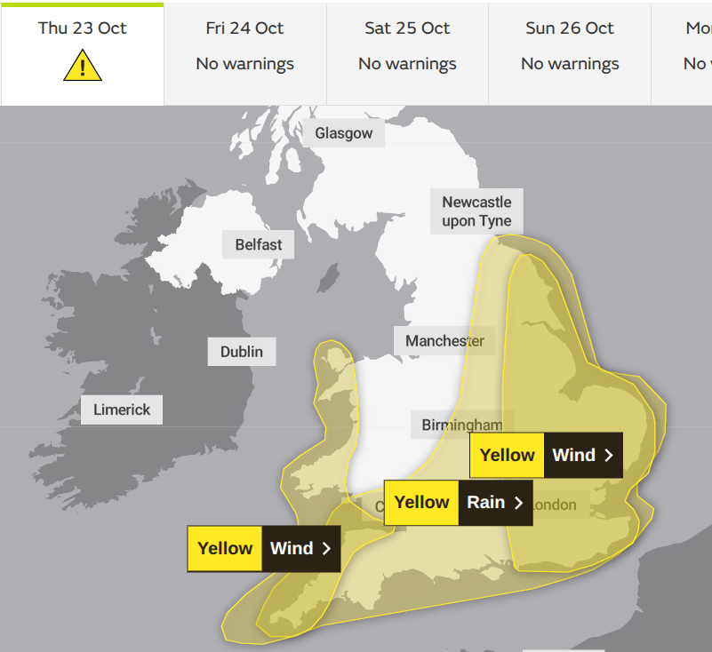 The UK Met Office has yellow warnings for wind and rain midweek as a deepening low pressure moves over England from France. This low has been named by Météo France, as Benjamin.