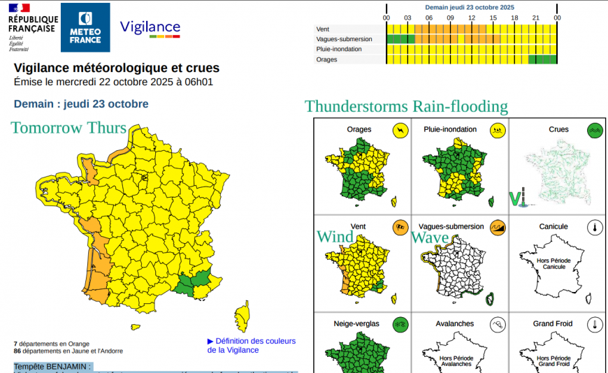 There are orange and yellow wind warnings across France starting on Wednesday night and through Thursday with gales and violent gusts expected. With large tides this week, the combination of strong W/NW winds, the surge of water from the low pressure and onshore, there are concerns about high waves for the Atlantic coast and coastal flooding.