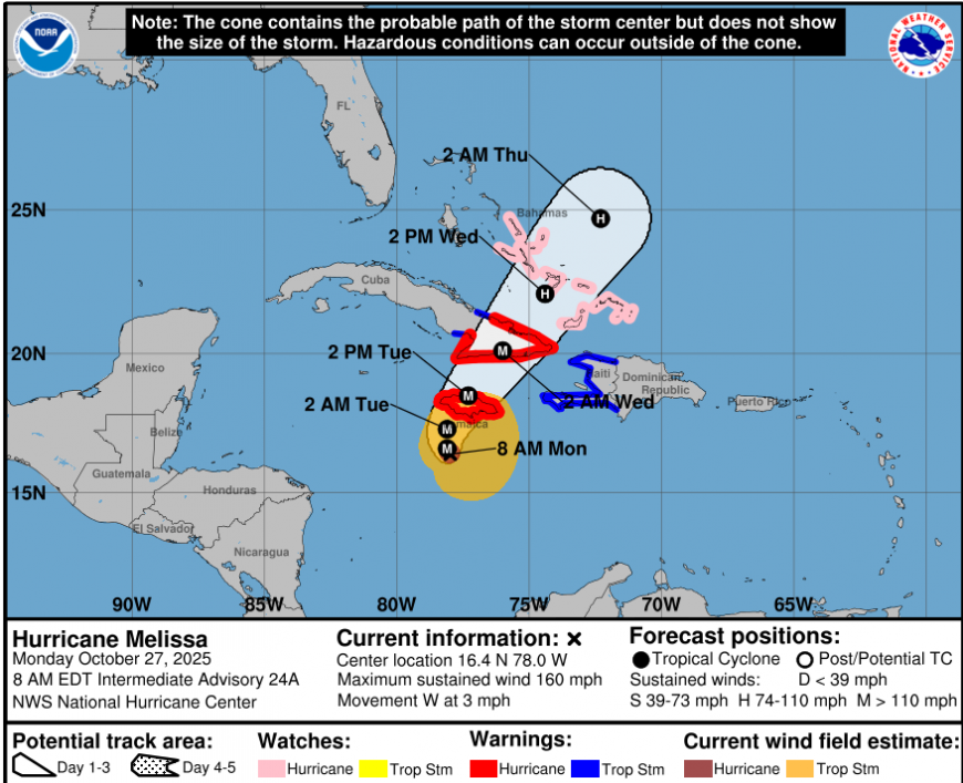 NHC Discussion “A painstakingly slow turn toward the northwest and north is expected during the next 24 hours, and Melissa is forecast to make landfall on the south coast of Jamaica Tuesday morning and emerge off the north coast by Tuesday afternoon.”