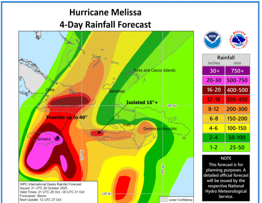 NHC - RAINFALL: Melissa is expected to bring rainfall of 15 to 30” to portions of Jamaica and additional rainfall of 8 to 16” for southern Hispaniola through Wednesday, with storm total local maxima of 40” possible. Catastrophic flash flooding and numerous landslides are likely. For eastern Cuba, storm total rainfall of 10 to 15” , with local amounts to 20”, is expected today through Wednesday”