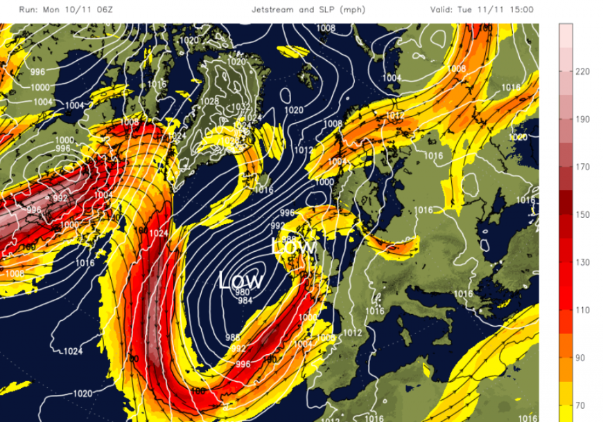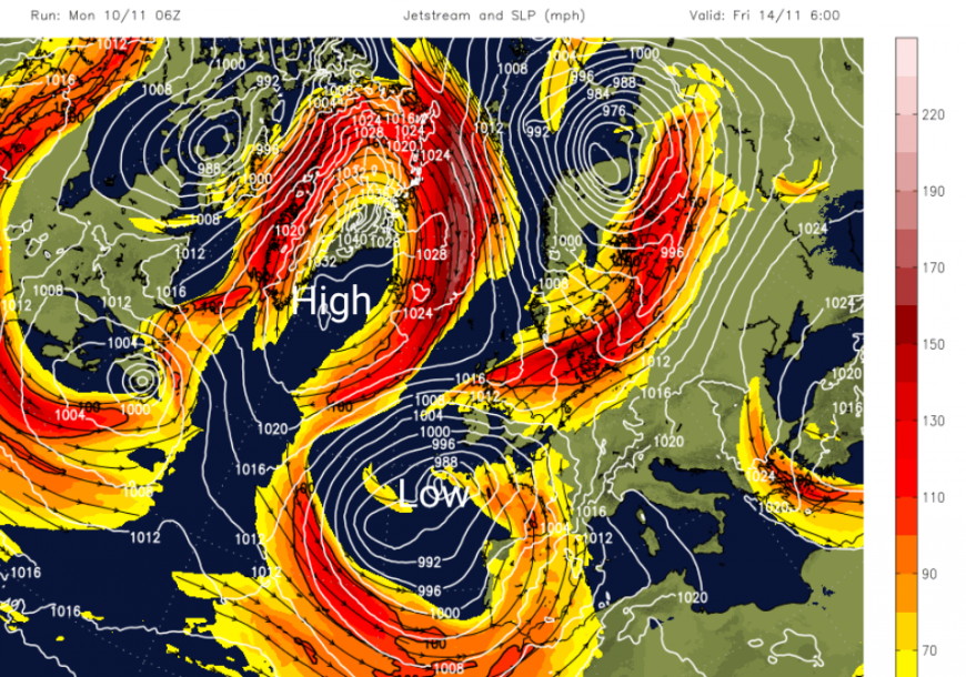 There will also be a lot of rain for parts of the UK, mostly for western areas as low pressures rattle in from the Atlantic. A large meander southwards in the jetstream will continue to feed low pressures past western Europe to the UK.