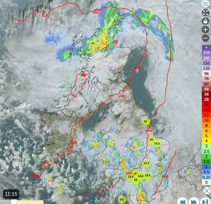 However, the trailing front could still be over southern counties of England with more cloud and showery outbreaks of rain for Wednesday morning. The fair weather in the middle stays but both areas of rain will develop. The southern band will edge over more of southern England into south Wales with more cloud as the low centre for northern Scotland could bring more rain over the mainland and blustery winds. Caithness could see some intense rainfall. Along with that colder northerly flow.