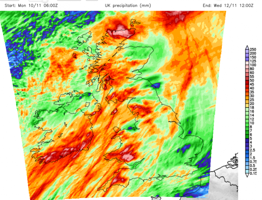 South Wales and southwest England will be wet especially over the Brecon Beacons, Dartmoor and Exmoor. High rianfall totals this week for the Cumbrian Fells, Yorkshire Dales, Snowdonia, also Dumfries & Galloway into the Pennines. The far north of mainland Scotland could see some very wet weather on Wednesday but then looks drier in the colder northerly flow.