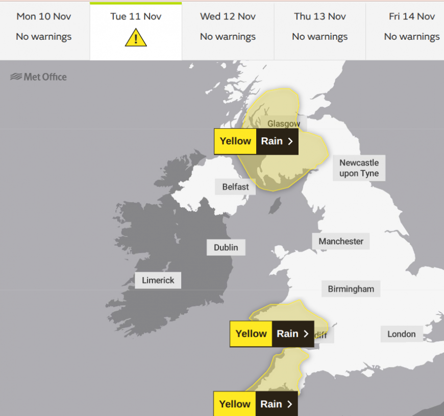 “Heavy rain during Tuesday afternoon and evening could lead to some flooding and disruption in places.” Wales.