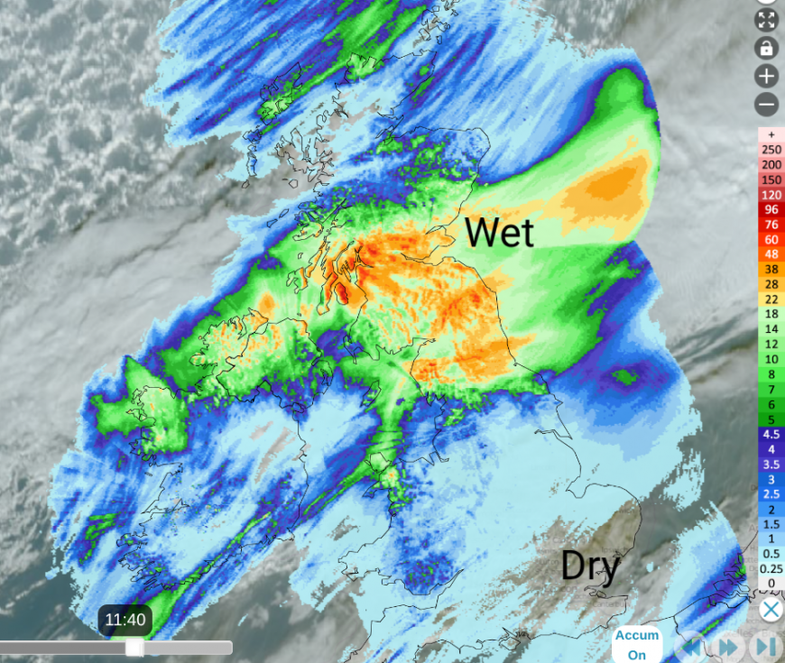 This zone of wet and windy weather will continue into Friday night, with pulses of heavy rain and the risk of flooding. It will be worth keeping an eye on the flood watches and warnings and signing up for updates from the Environment Agencies. The rainfall accumulation predictions from the UKV model show heavy, welcome rain for eastern England but there are concerns for SE Wales into the Midlands.