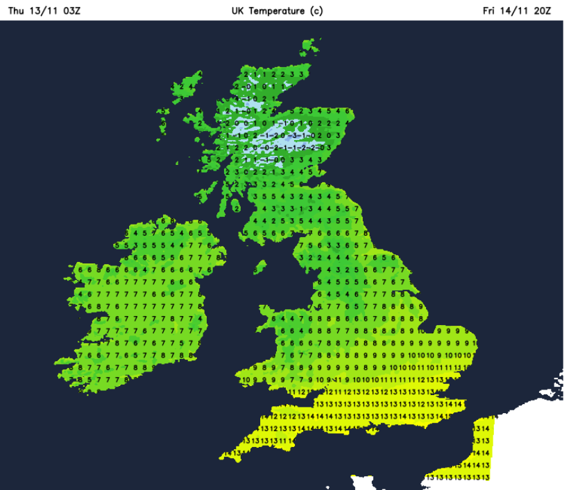 There will be zones of wet weather to end the working week. For Thursday, this has been the Central Belt of Scotland, southern Scotland, northern England, Northern Ireland (particularly northern counties). This is the main frontal boundary between the mild air in the south and the cooler conditions in the north. There have been some wintry showers coming into northern mainland Scotland and the Northern Isles, and a dusting of snow has been reported over the Cairngorms.