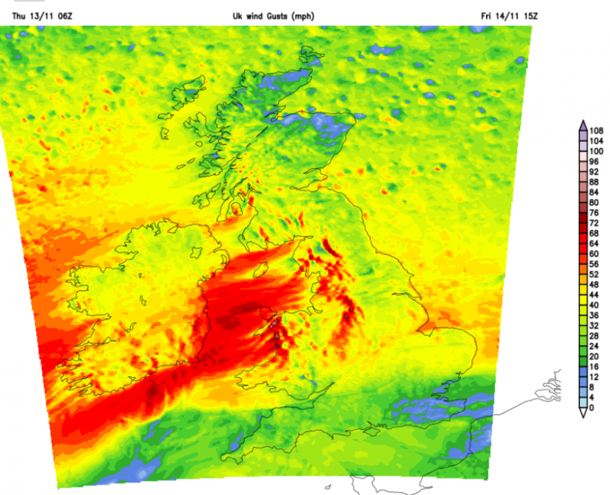 Added to that, there will be freshening easterly winds, with strong lee gusts (see red areas) making Friday afternoon and evening really miserable. To the lee of the Pennines and Welsh mountains there will be sudden gusts, over 55mph. It will feel cold and be wet and windy with tricky conditions on the roads for the evening rush hour. Further north in the clearer air, it will be cold.