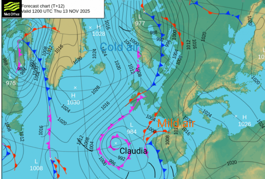 High pressure will be anchored to the south of Greenland, steering the cold air southwards to the UK on Thursday but as the high extends our way on Friday, the cold Arctic plunge will shift over Scandinavia. With pressure rising over Scotland, it will be drier, sunnier but feel cool in an easterly flow and a few wintry showers for Grampian. Spain and Portugal have seen wind and rain warnings from (Storm) Claudia, the large low in the eastern Atlantic. This storm has been named by the Southwestern Group (rather than the Western naming group that the UK is in).
