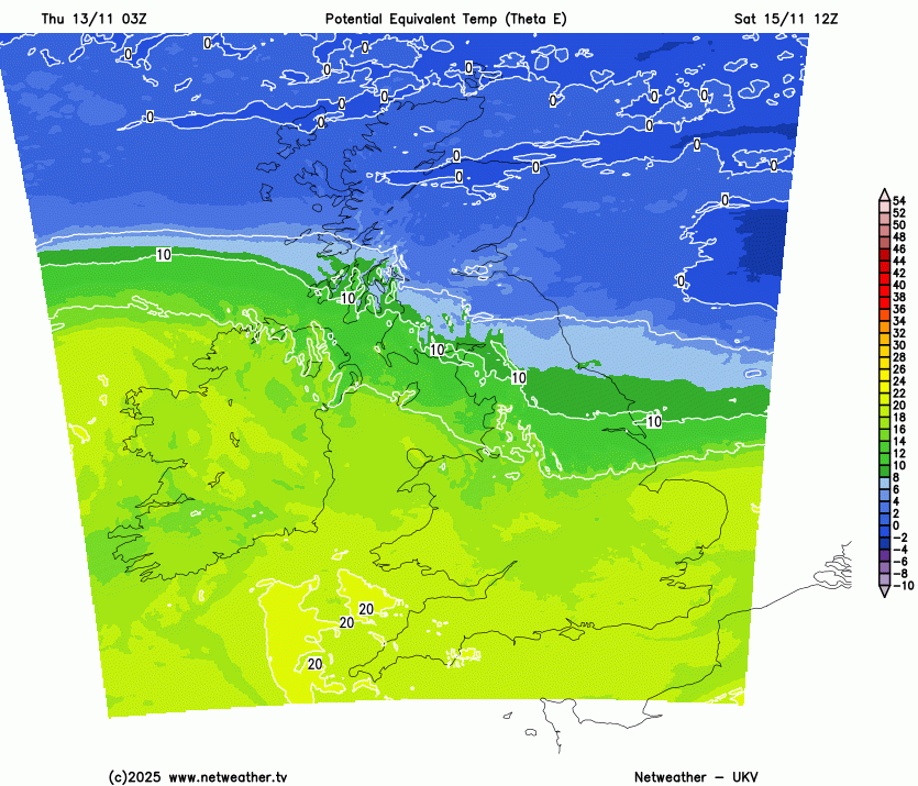 This airmass battleground is slowing the progress of numerous rainbands which are soaking parts of Britain over several days.