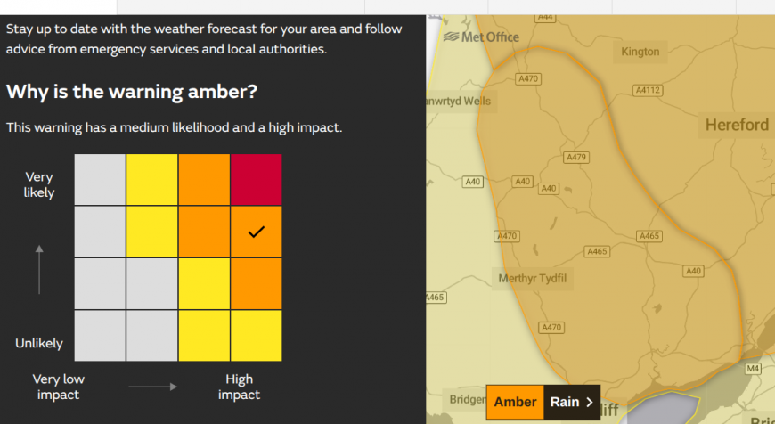 Natural Resources Wales “Widespread flooding is probable from rivers and surface water in the south-east of Wales today (Friday) where many properties could flood, and conditions may be dangerous to life. Whole communities could be affected. There could be disruption to travel and essential services.”