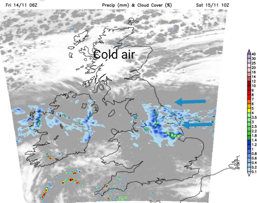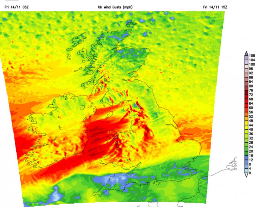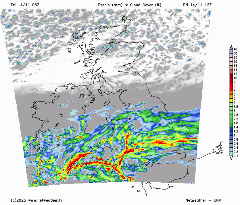 We’ve had two bands of rain combining on Friday, including Claudia’s warm front from the south. The cold front will arrive from the southwest during Friday afternoon with some embedded intense bursts. The UKV has very heavy rain around the Bristol Channel by mid-afternoon. The frontal band continues to bring rain across parts of Wales and central/eastern England as heavy, even thundery showers appear from the southwest. These will move over southern England up into the Midlands and then The Wash this evening and overnight.