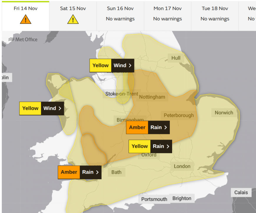 There is a risk of surface water flooding, river flooding and travel disruption. There is a wide yellow rain warning over England and Wales but a sizeable Amber warning highlighting a medium likelihood and medium impacts from The Wash across the Midlands, S.Yorkshire into north Powys. There is a smaller area of particular concern over SE Wales.