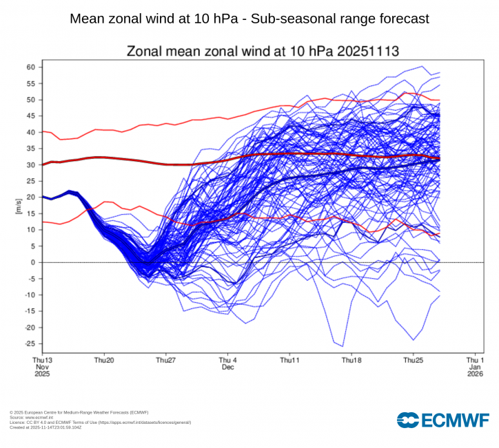 ECMWF ensemble mean for zonal mean zonal winds at 10hPa 60N reaching 0 m/s, though last few days the mean is above, so slightly less members going for a reversal