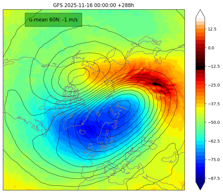 The much colder conditions look to ease next weekend, as winds turn more westerly, with Atlantic systems rolling in, bringing milder Atlantic air and the usual spells of rain and windy conditions. However, high up over the higher latitudes of the northern hemisphere, the models have for a while now been forecasting zonal or westerly winds in the stratosphere, which wrap around the polar vortex, weakening and perhaps reversing briefly. If the winds reverse at 10 hPa 60N, i.e. zonal winds falling below 0 m/s, then this would be technically known as a Sudden Stratospheric Warming. This is due to a significant warming of the stratosphere taking place from the Canadian side of the polar region, which looks to displace the stratospheric polar vortex from its usual home over the arctic towards northern Russia and NE Europe.