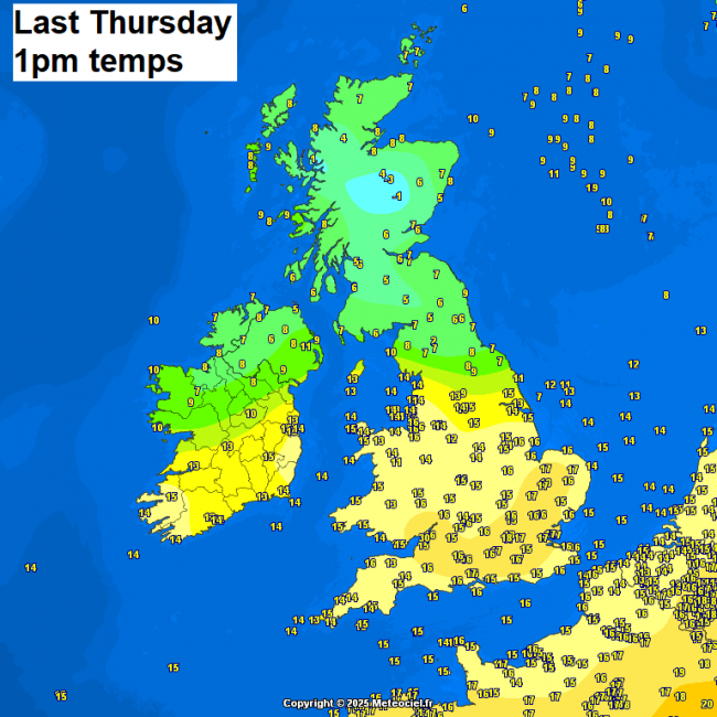 Saturday and Friday both saw 16C reached in southern England, Thursday reached 18C at Heathrow and Wisley (Surrey), while temperatures reached the mid-teens earlier in the week. So it will be quite noticeable across the south the change to much colder conditions sweep south through the week, especially by Thursday, as a more potent plunge of cold arctic air arrives from the north behind an area of low pressure moving southeast across the country mid-week. Temperatures on Thursday could struggle to reach mid-single digits even in the south, with highs of 3-6C, some 10C lower than what we’ve seen over recent days in the south!