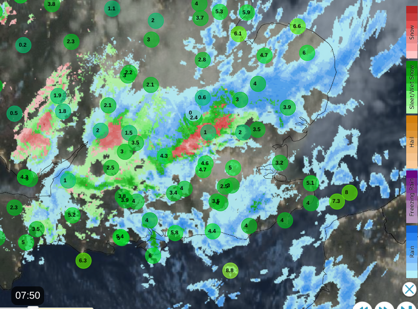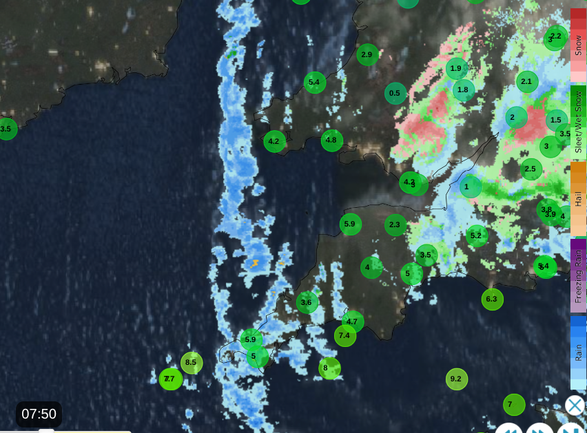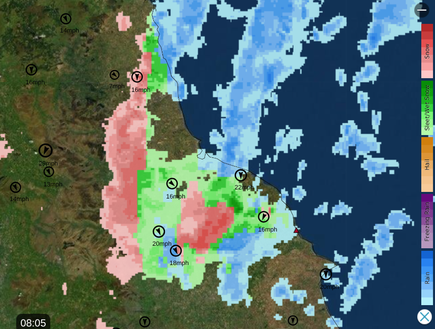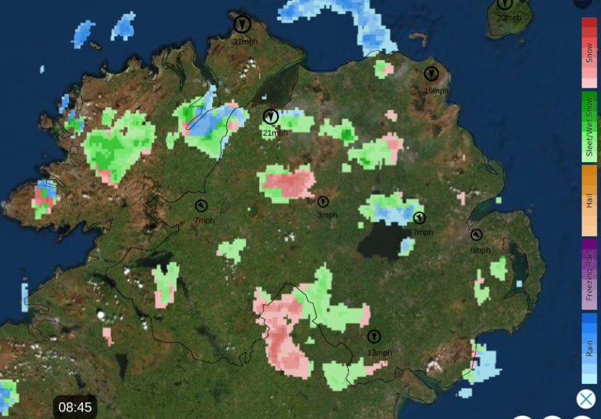 Netweather Radar showing air temperatures before 8am and a wet, wintry mix on frontal band heading SE