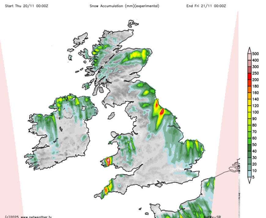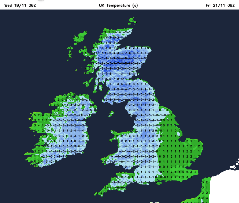 Aberdeen, Glasgow and Edinburgh will only reach 3C today. Inland tonight, most of these showers will be as snow with a higher risk of ice. Northern Scotland could see 5 to 20cm of snow in places, depending on the shower distribution. This will be a taste of winter midweek.