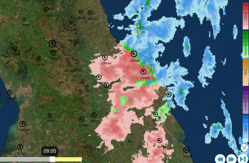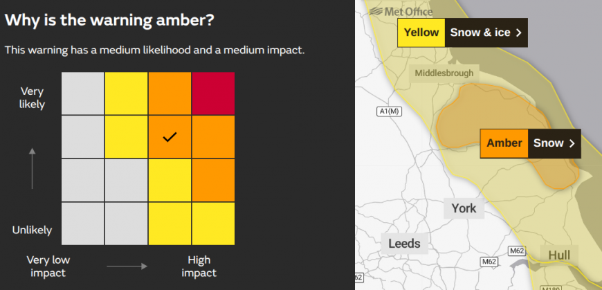 “Frequent wintry showers will feed inland from the North Sea, giving significant snow accumulations over the North York Moors and parts of the Yorkshire Wolds. By the end of Thursday, as much as 15-25 cm may have accumulated on hills above 100 m elevation, which is likely to cause substantial disruption. Gusty winds, giving occasional blizzard conditions, and perhaps a few lightning strikes” Met Office