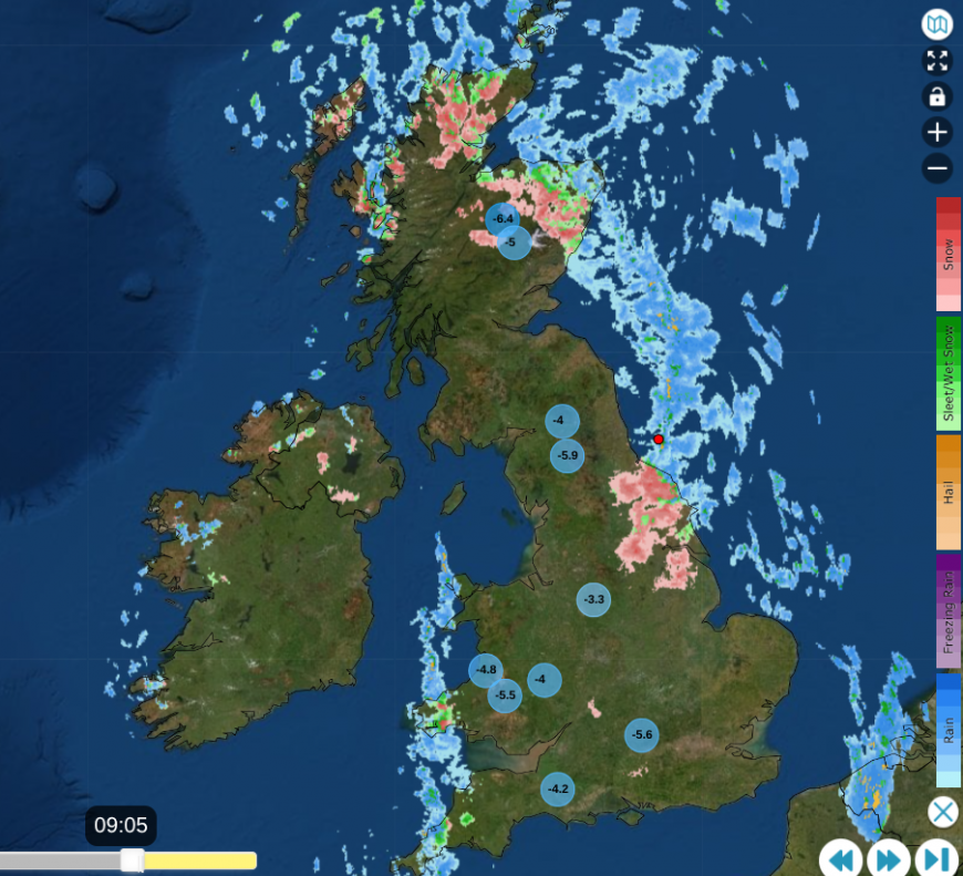 The cold Arctic flow continues on Thursday, bringing further snow showers to exposed parts of the UK. Northern Scotland has borne the brunt of the incoming snow, with plenty of wintry showers running down the east coast of England. There is an Amber warning for snow in force for Redcar and Cleveland, the East Riding of Yorkshire and North Yorkshire, with particular concerns over the Moors.