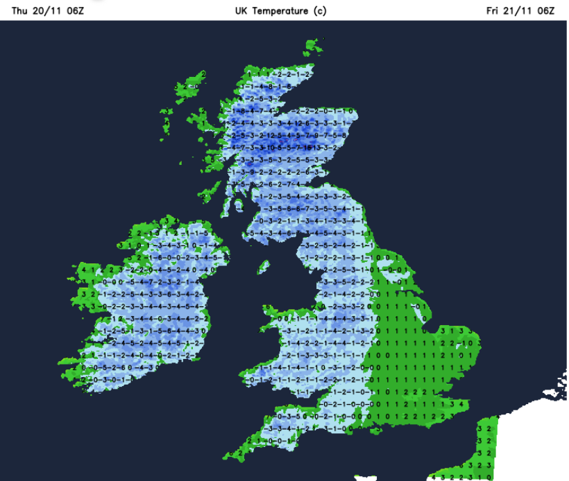 It will be a cold, clear night with very light winds and a widespread frost. Temperatures over the snowfields of Highland Scotland could fall to -12C.