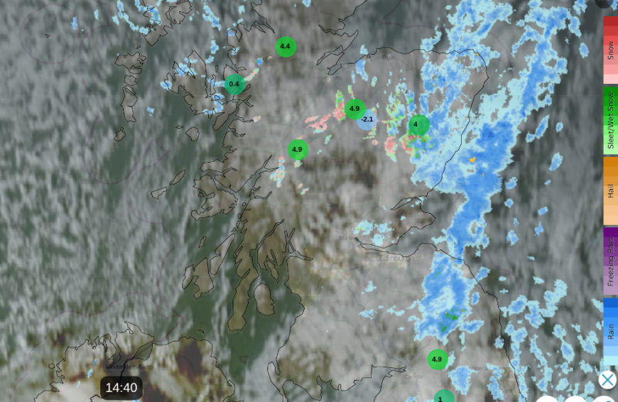 There has been a little bit of snow on Monday over the highest peaks, over the Cairngorms and the Cheviots, with a wintry mix as the showers reach the Pennines. At times, the rain might look icy, but it’s a different picture from last week when the shower pattern did bring snow. There is also a Pembrokeshire Dangler setup in this northerly wind but again, it is rain showers for SW Wales and Cornwall.