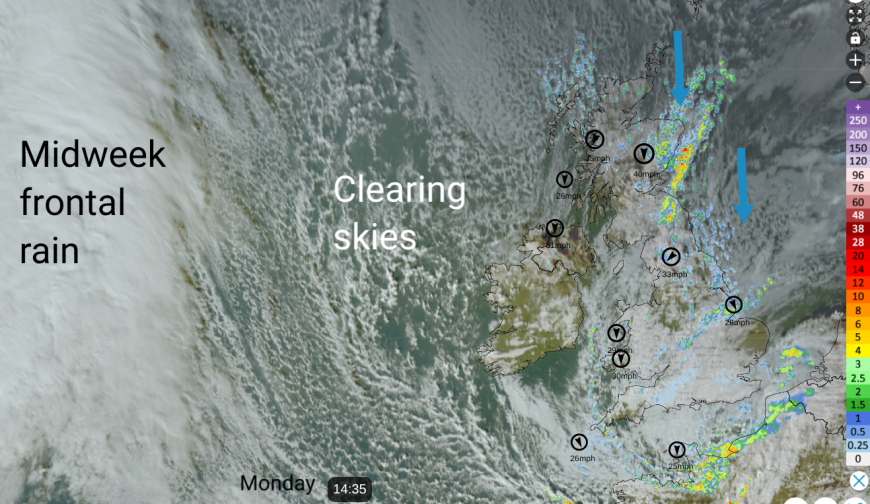 The nose of high pressure will do a good job of subduing any precipitation until an Atlantic weather front arrives from the west on Wednesday morning. This is rather patchy rain and is mixed up with milder air in a southerly flow. There could be some initial wintriness over the NW Highlands but again, it will mostly be rain.