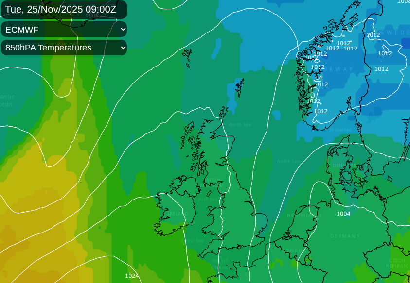Our airflow is wrapped around a low pressure which brought rain to the UK on Sunday and today. Last week, we had an ongoing northerly wind direct from the Arctic. With a high to the west and a low to the east, anchoring the feed.