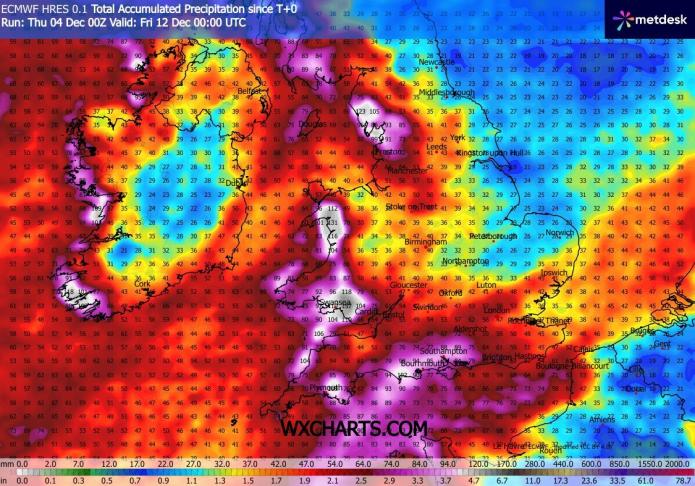 As well as potential for strong winds, rainfall totals will be adding up over the coming days, with the ground already saturated in parts of the west, further rain will mean river levels will be getting high, with flood alerts and warnings on the increase. Western areas and the far south look to see the highest rainfall totals. Over 100mm forecast by ECMWF over the moors of SW England, the far south of England, Wales, Cumbria and western Scotland by this time next week - these areas most exposed to the moist southwesterly flow.