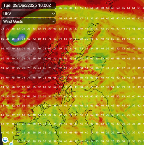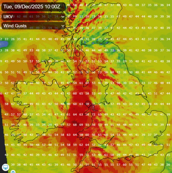 Very strong and gusty southerly winds with gales possible near coasts will develop from the south in the early hours of Tuesday across Ireland, N. Ireland, Irish Sea coasts of Wales then later across western Scotland. Gusts of 60-70mph possible near coasts and over hills in these areas. There are yellow wind warnings issued by the Met Office for SW England, Wales and western Scotland and by Met Eireann for southern Ireland.