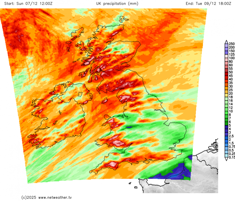 There will naturally be some variation in rainfall totals across the area, but accumulations of 20-40 mm are likely in quite a few places, with 60-80 mm over Dartmoor and high ground in Wales. There is a small chance of 80-100 mm falling over the most exposed, prone hills