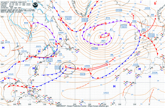 The low formed off the North Carolina coast of the eastern seaboard of the USA on Friday and has since been tracking east across the North Atlantic under a strong jet stream. The low is quite shallow and elongated along a frontal zone over the NW Atlantic early Sunday evening. However, the low will start to speed up in forward motion and deepen more over the next 24 hours as a sharpening shortwave trough coming out of eastern Canada engages the low and baroclinic zone that it lies along. The deepening low will also encounter increasing divergence aloft as it alternates between being under the left exit and right entrance regions of a strong jet stream running aloft.